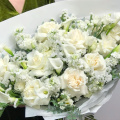 Авторский букет из розовых роз, зеленых диантусов и белых эустом в упаковке