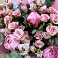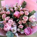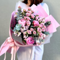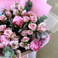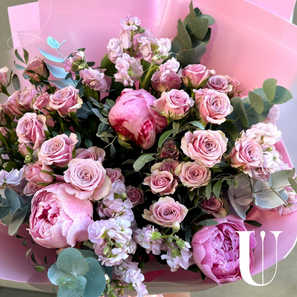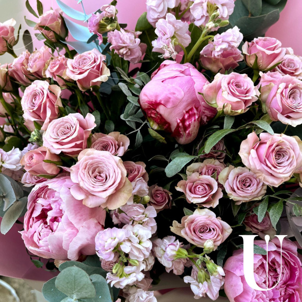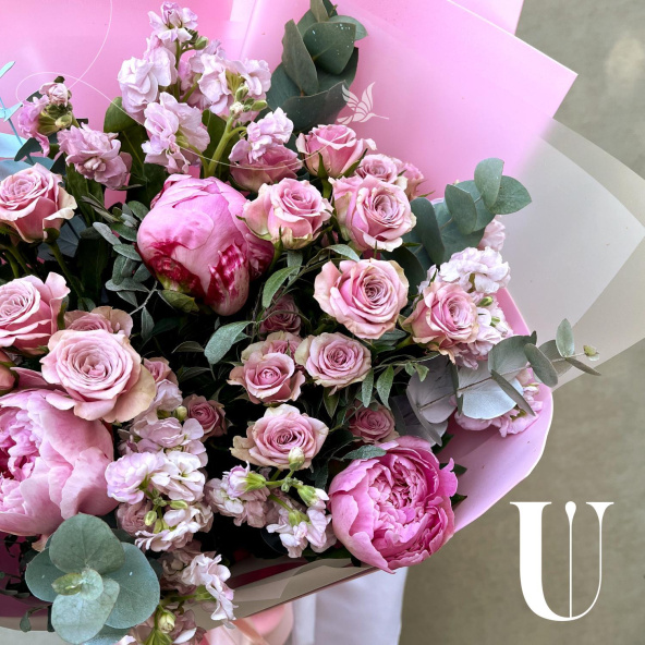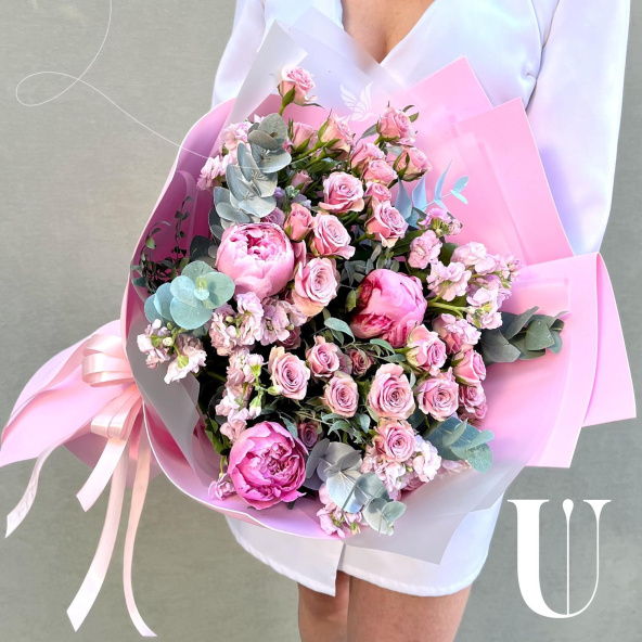 Магическая красота — волшебная композиция из кустовых роз, пионов и ароматной маттиолы с листьями эвкалипта, создает атмосферу таинственности и чарующей красоты.