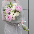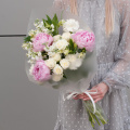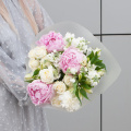 Букет цветов "Ти амо" - это сборный букет, состоящий из различных видов цветов, таких как пионы, розы, альстромерии, маттиолы и гвоздики.
