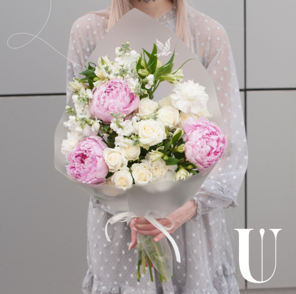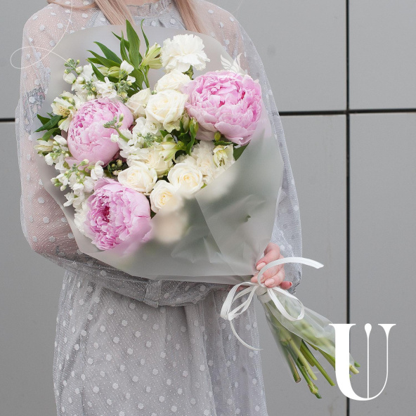 Букет выполнен в розовых и белых тонах, что делает его ярким и запоминающимся.