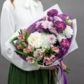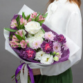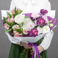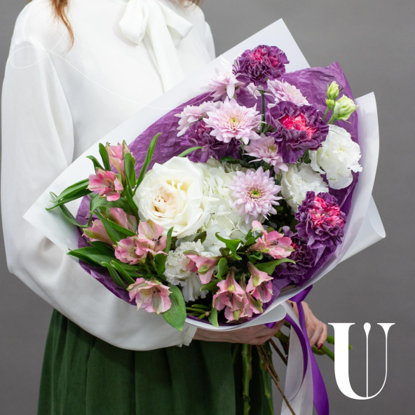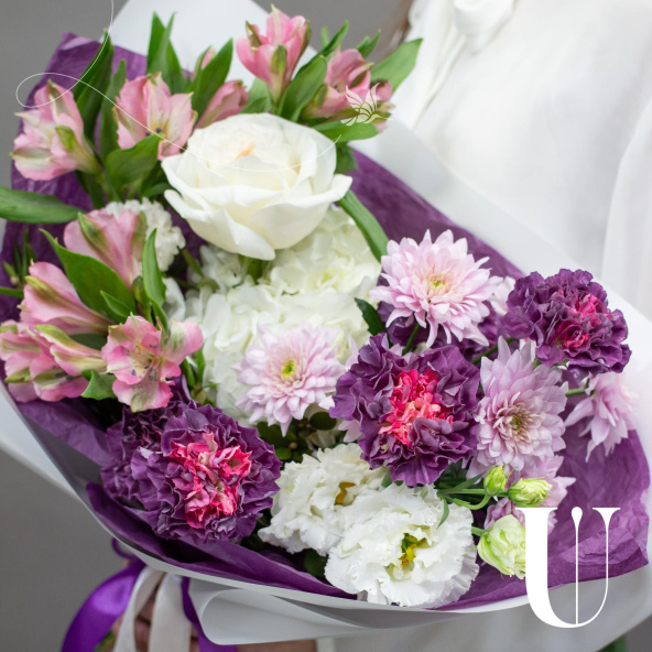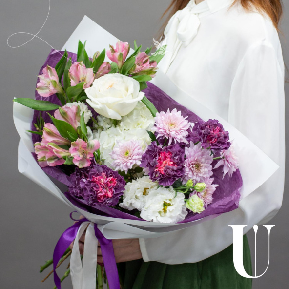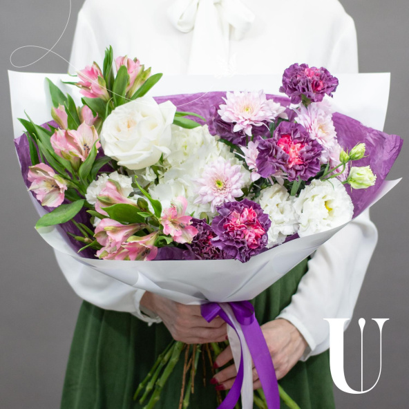 Белая гортензия, роза Вайт О’Хара, розовая альстромерия, бежево-розовая кустовая хризантема, белая эустома и гвоздика Гипноз создают гармоничную и насыщенную композицию. Контраст белых, розовых и пурпурных оттенков делает букет выразительным, а белая упаковка подчеркивает форму букета. Компактный формат делает букет удобным для подарка, передавая ощущение свежести и современного стиля.