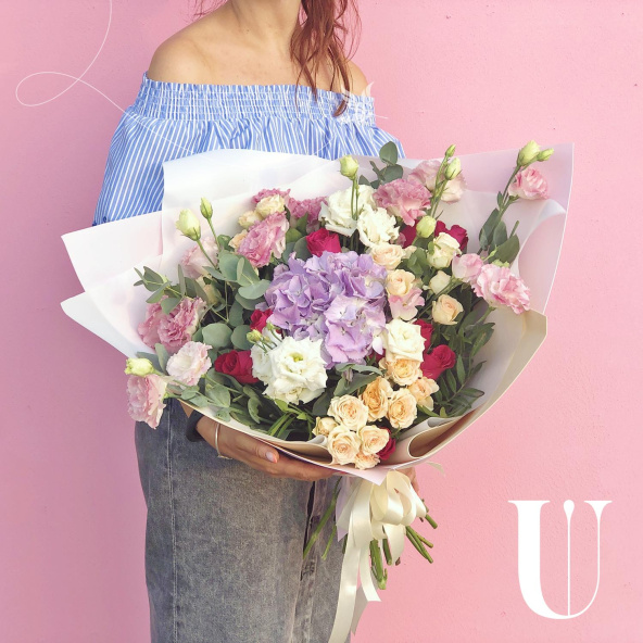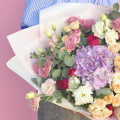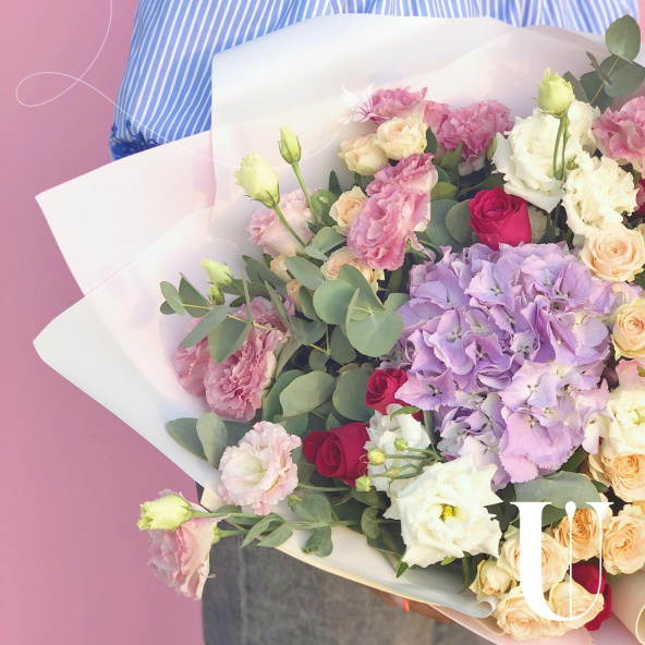 Авторский букет из розовой гортензии, роз Кахала, белой лилии и белых маттиол в дизайнерской упаковке