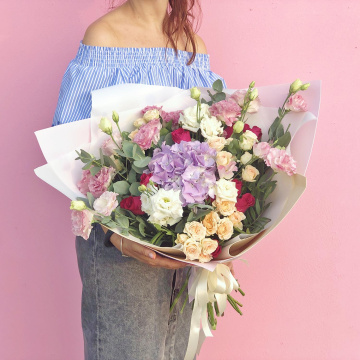 Букет из пионовидных роз, маттиолы, эустомы и других цветов