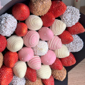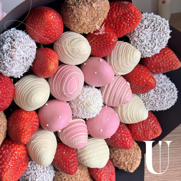 Свежая клубника в сочетании с бельгийским шоколадом даёт незабываемые впечатления. В данной композиции мы использовали белый, молочный и розовый шоколад - что привело к невероятно нежному сочетанию. Так и хочется его съесть