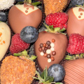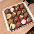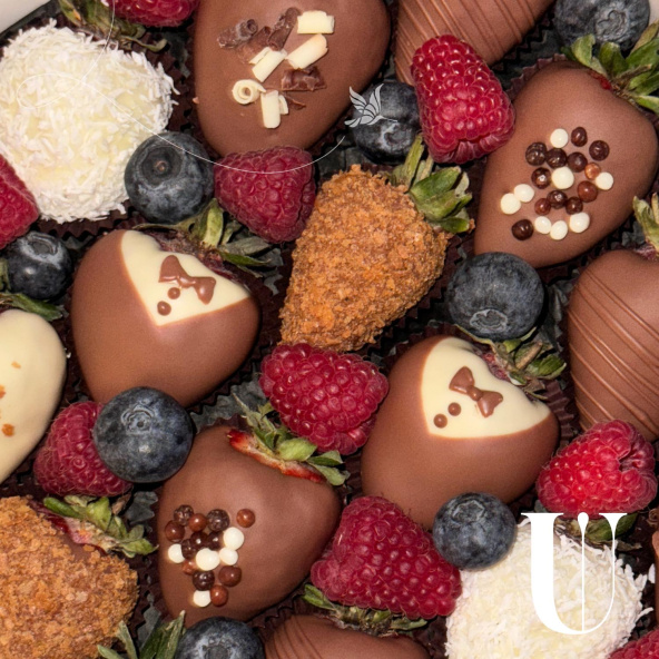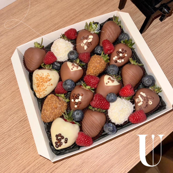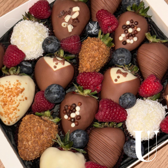 Набор с изюминкой. Клубнички смокинги словно киндеры! Двойное удовольствие! А так же мы добавили свежие ягоды голубики и малины.