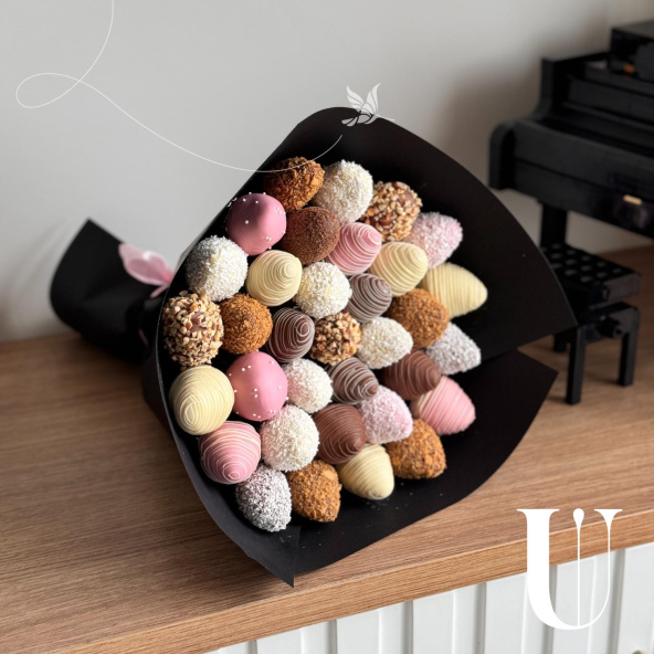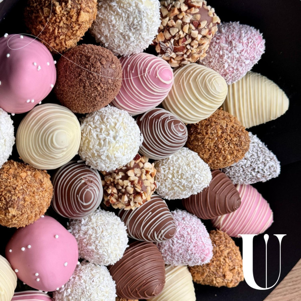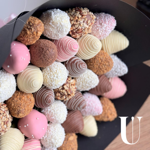 Свежая клубника в сочетании с бельгийским шоколадом даёт незабываемые впечатления. В данной композиции мы использовали белый, молочный и розовый шоколад - что привело к невероятно нежному сочетанию. Так и хочется его съесть