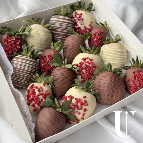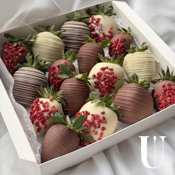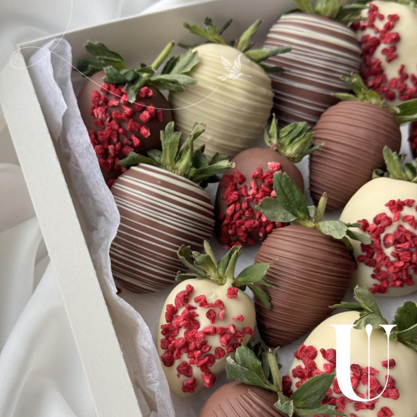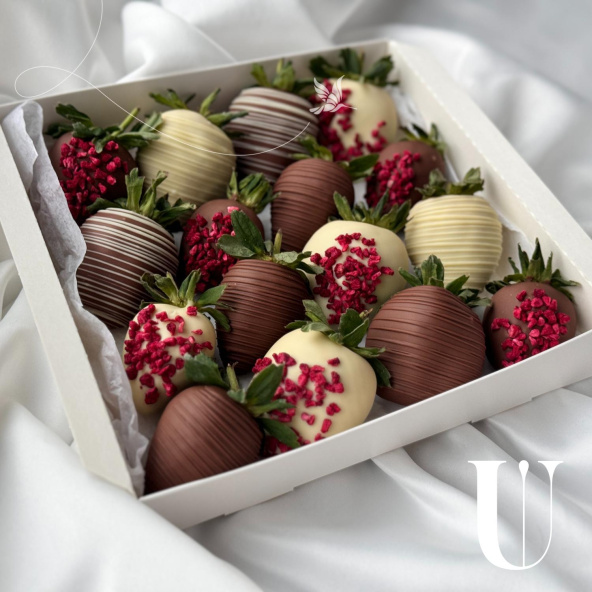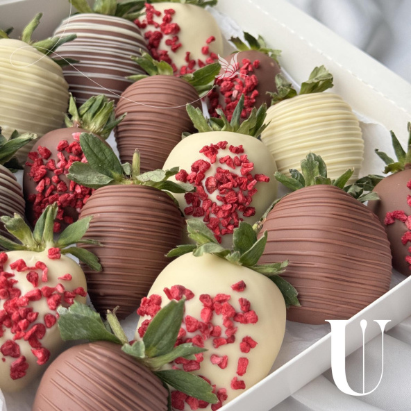 Безумно аппетитное сочетание клубники в молочном и белом бельгийском шоколаде, украшенной сублимированной малиной и фирменными узорами