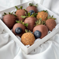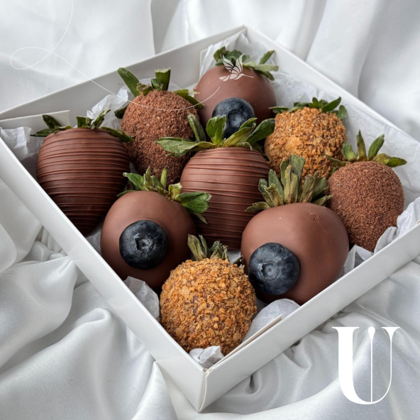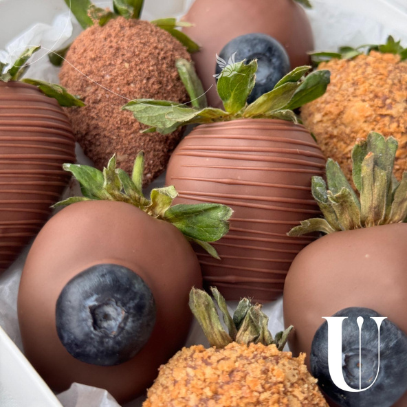 Набор из клубники в молочном бельгийском шоколаде. Мы украсили свежей голубикой и вафельной крошкой. Идеальное сочетание.