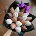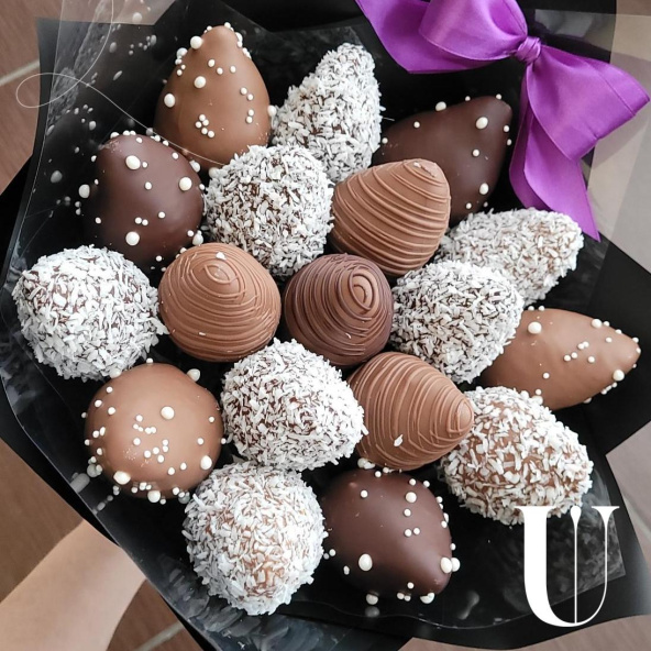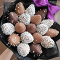 Нежнейший десерт, состоящий из свежей ароматной клубники, покрытой слоями тёмного и молочного шоколада, щедро посыпанной хрустящей кокосовой стружкой. Такой подарок станет изысканным угощением на любой праздник и ярким дополнением романтического вечера.