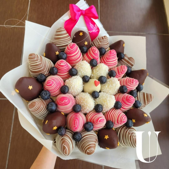 Букет из свежих ягод и клубники, бережно заключённых в три вида шоколада с нежными нотками свежей голубики. Идеальное сочетание вкусов для настоящих гурманов.