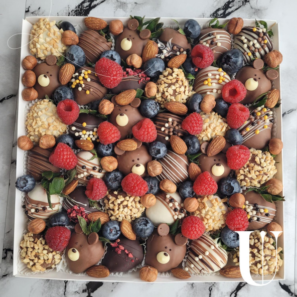 Большой набор свежей клубники, щедро покрытой молочным, тёмным и белым шоколадом, дополненный ароматной голубикой и сладкой малиной. Идеальное сочетание вкусов и текстур для настоящих гурманов.