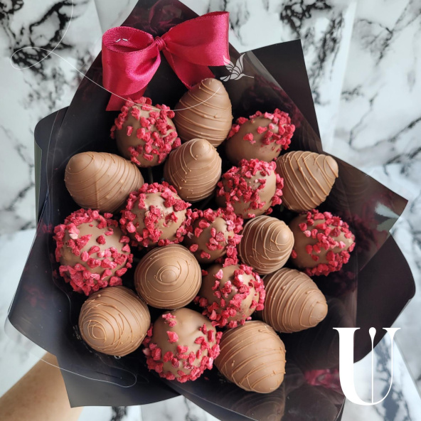 Изумительный десертный подарок — свежая клубника, покрытая нежнейшим молочным шоколадом и украшенная яркими ягодками сублимированной малины. Такой букет станет ярким штрихом любого торжества и покорит сердце сладкоежки с первого взгляда.