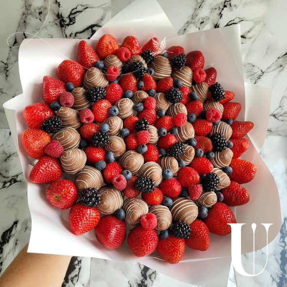 Этот уникальный букет состоит из свежей ароматной клубники, покрытой нежным слоем молочного шоколада, дополненной яркими ягодами ежевики, малины и голубики. Настоящий гастрономический подарок, который порадует своим ярким внешним видом и изысканным вкусом. Отличный выбор для праздника или простого выражения любви и заботы.