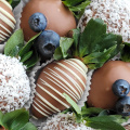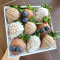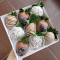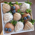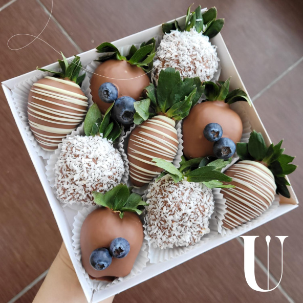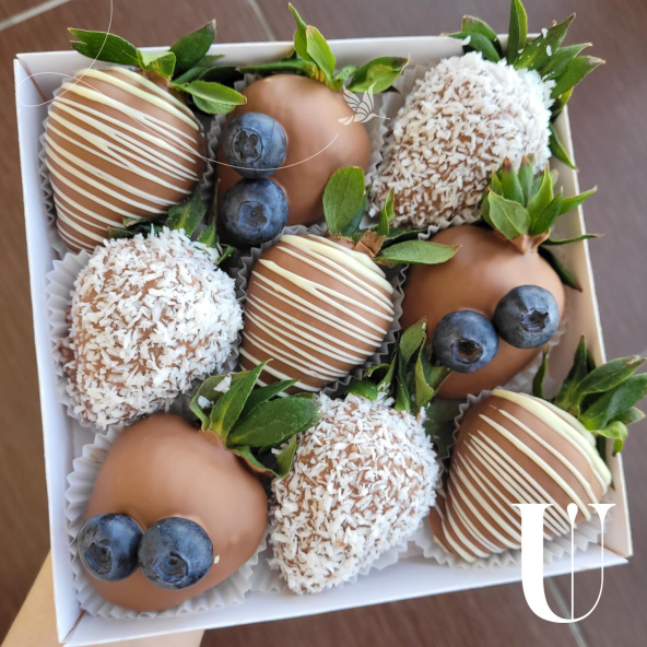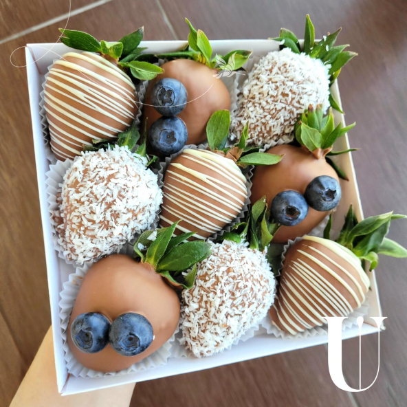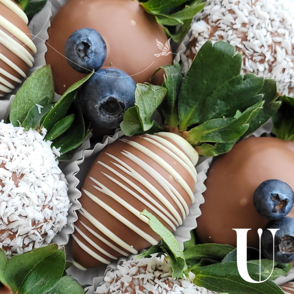 Набор ручной работы из свежайшей клубники, покрытой нежным слоем молочного шоколада с добавлением свежей голубики и кокосовой стружки. Отличный подарок для любителей оригинальных десертов и изысканных сочетаний вкусов.