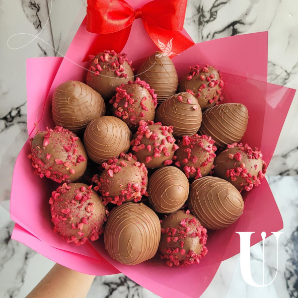 Нежная клубника в сочетании с насыщенным вкусом молочного шоколада и ярким ароматом сублимированной малины создаёт уникальный десерт, который порадует сладкоежек и станет изысканным подарком любому гурману.