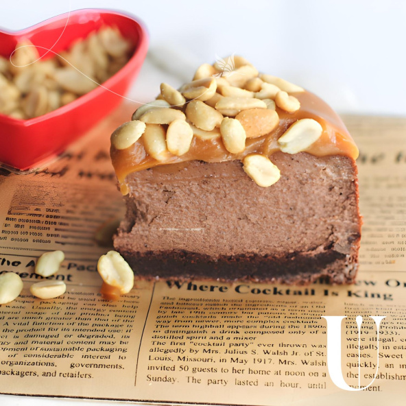 Состав: творожный сыр, сливки 33%, яйца, пшеничная мука, кукурузный крахмал, сливочное масло, сахар, ваниль, темный бельгийский шоколад, арахис, фундучная паста, какао.