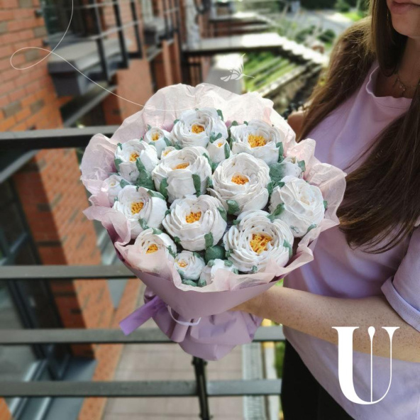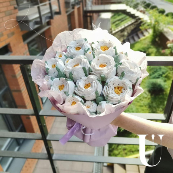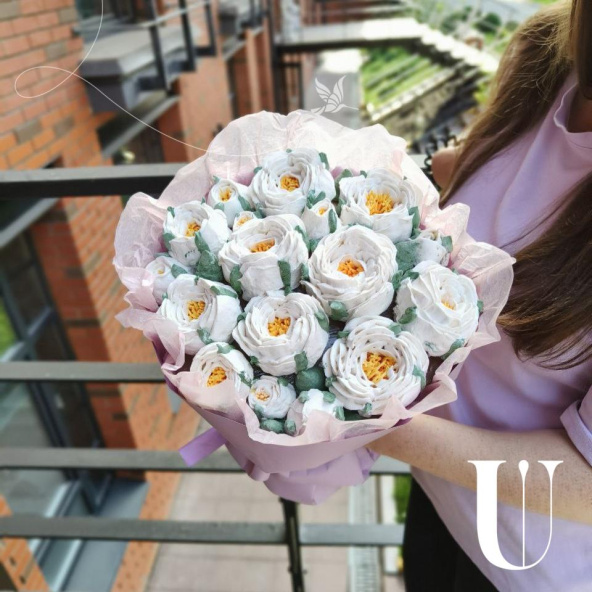Милый букет из зефирных цветов! Классное универсальное сочетание как по цветам, так и по цветовому сочетанию понравится вашей получательнице , тем более, что букет можно попробовать! Зефир не сладкий, полностью натуральный!