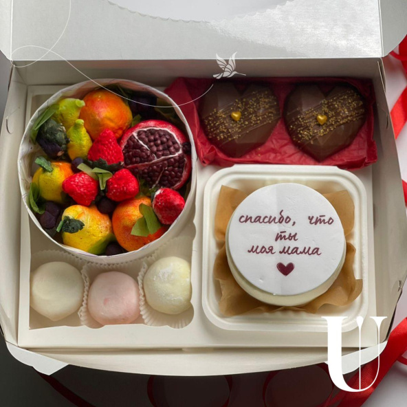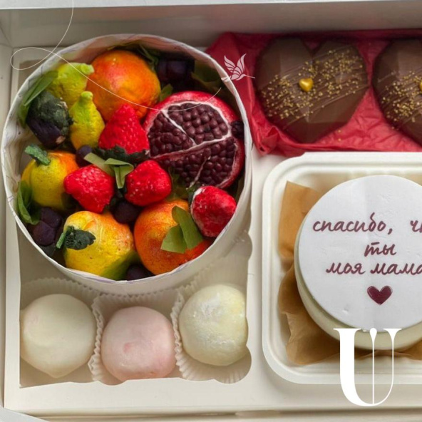Классный набор для мамы, мы в нем собрали все самое красивое и вкусное! Зефир ручной работы в виде фруктов и ягод , дубайский шоколад с фисташкой, Моти и тортик с милой надписью , которая точно порадует и попадет в самое ♥️