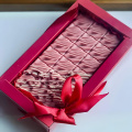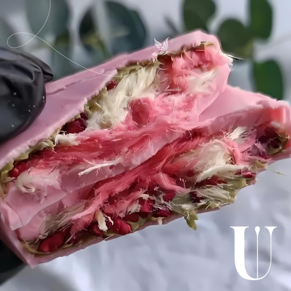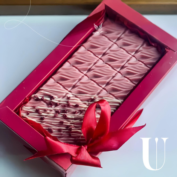 Состав: шоколад белый Callebaut 28%, паста фисташковая, малина сублемированная, пишмание со вкусом граната, пишмание со вкусом ванили.