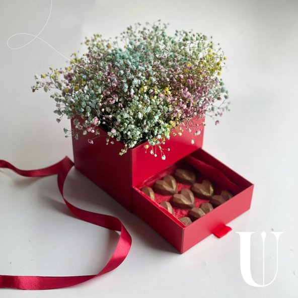 Подарочная шкатулка с гипсофилой и дубайским шоколадом №3