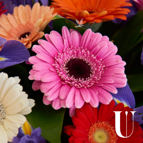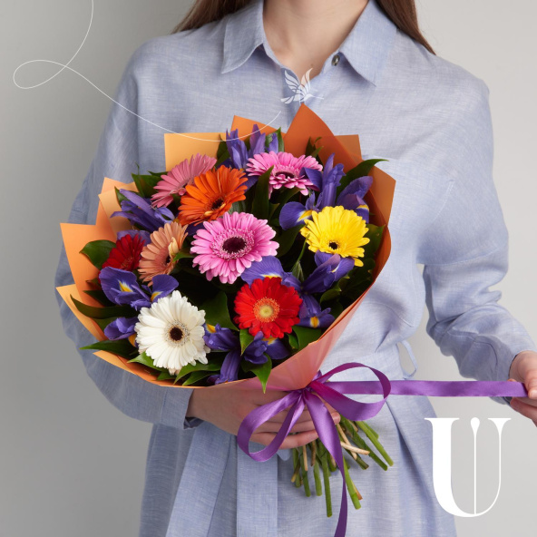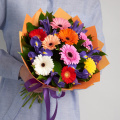 Композиция из роз, гербер и альстромерий розового цвета в дизайнерской пленке
