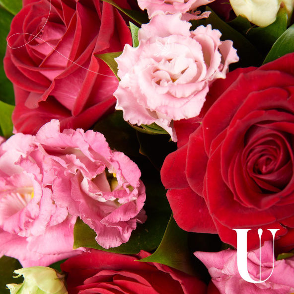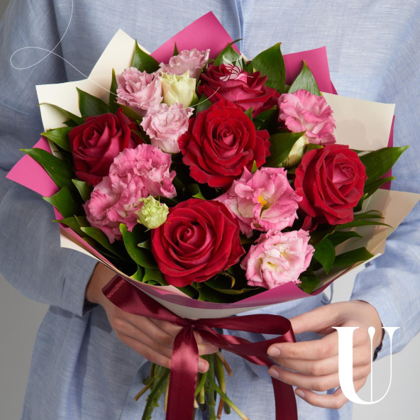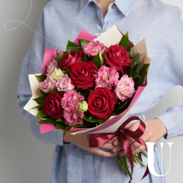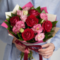 Букет из роз Вау 50 см и розовых лизиантусов в упаковке