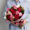 Авторский букет из розовых кустовых роз, розовых диантусов и белых хризантем в розовой упаковке