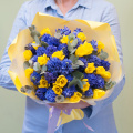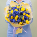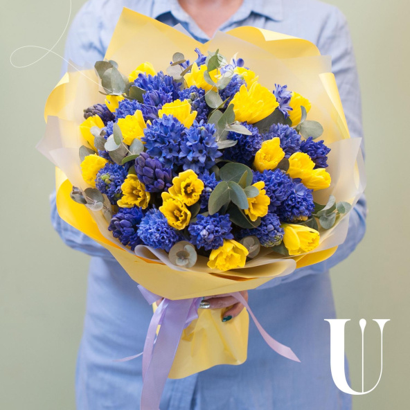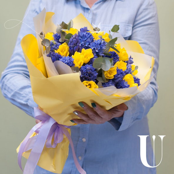 Букет состоит из 45 цветов, включая 25 синих гиацинтов и 20 желтых нарциссов. Зеленые ветви эвкалипта добавляют свежести и аромата, делая композицию еще более привлекательной.