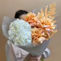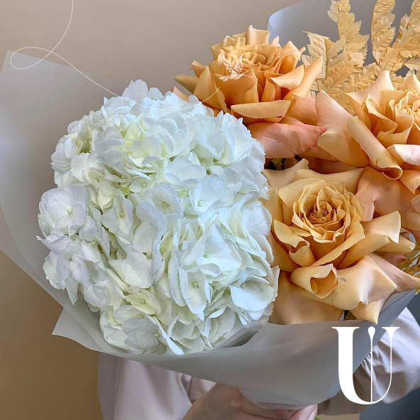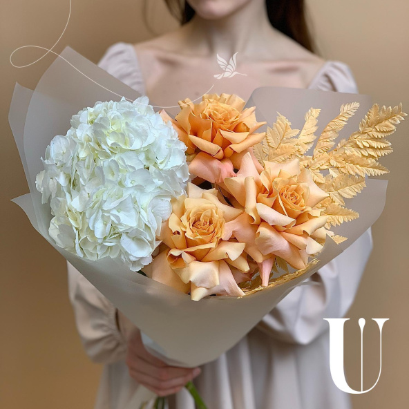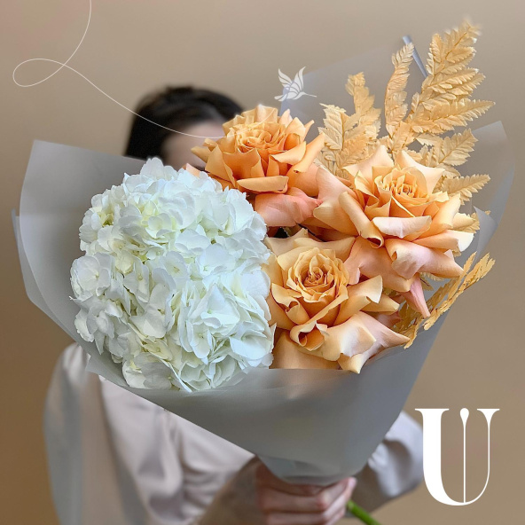 Этот букет - это воплощение тепла и света в сочетании с нежностью и легкостью. В его основе находятся пионовидные французские розы, гортензия добавляет легкости, а стабилизированный папоротник благородства и утонченности. Букет представлен в яркой, солнечной оранжевой палитре, создавая атмосферу радости и позитива.