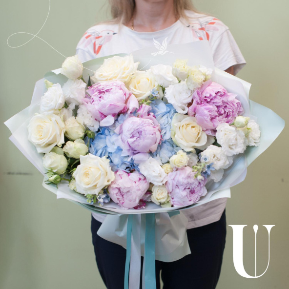 Букет выполнен в голубом и розовом цвете, что придает ему свежесть и нежность.