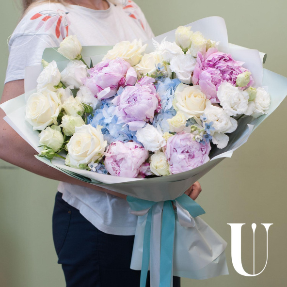 Букет цветов "Примадонна" - это изысканный и стильный подарок, который подойдет для любого повода. Он состоит из разнообразных видов цветов, включая гортензию, пион, эустому, оксипелатум, розу и розу кустовую, что делает его уникальным и привлекательным.