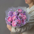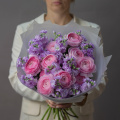 Букет в фиолетовой гамме из роз Миритим и кустовых пионовидных роз в упаковке