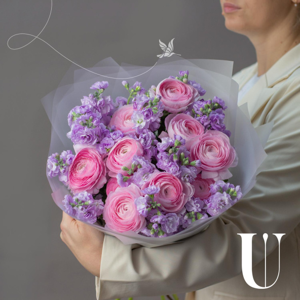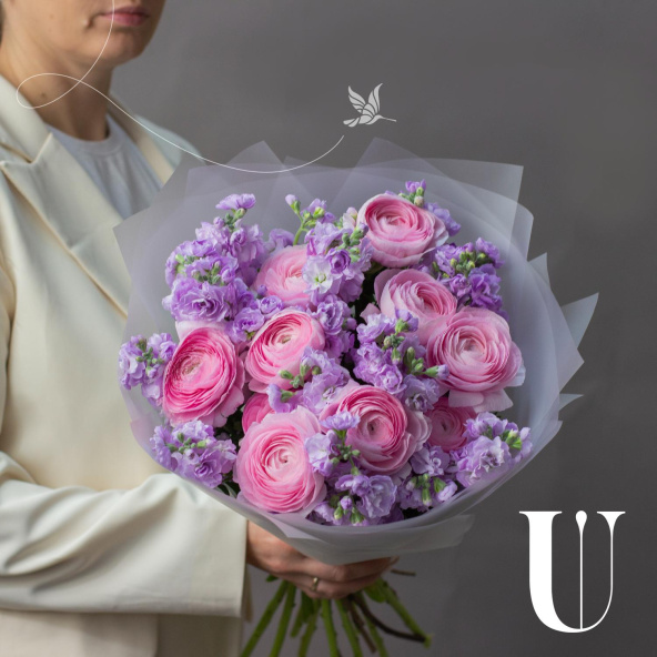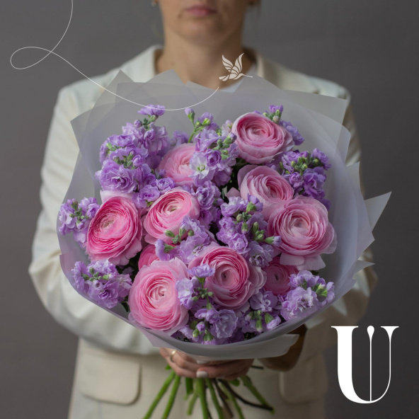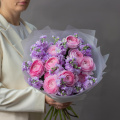 Букет из розовых пионов и лавандовых маттиол в розовой упаковке
