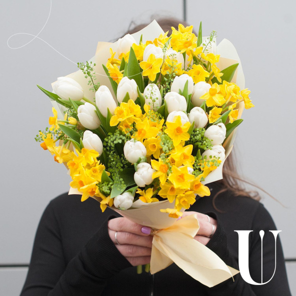 Букет из белых тюльпанов и желтых нарциссов "Весенняя радость" - это стильный и яркий подарок, который подойдет для любого повода.