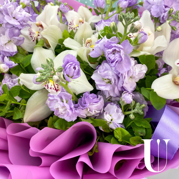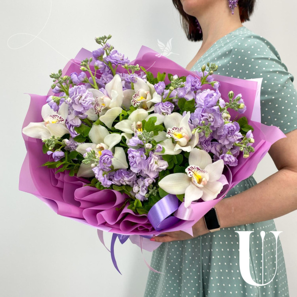 В центре композиции — семь величественных белоснежных орхидей, символов грации и утончённой красоты. Их хрупкая роскошь дополнена кустовой матиолой лавандового оттенка, которая окутывает букет легким облаком аромата и добавляет глубины и текстуры.