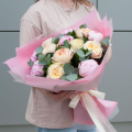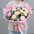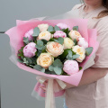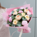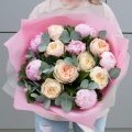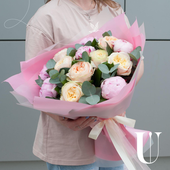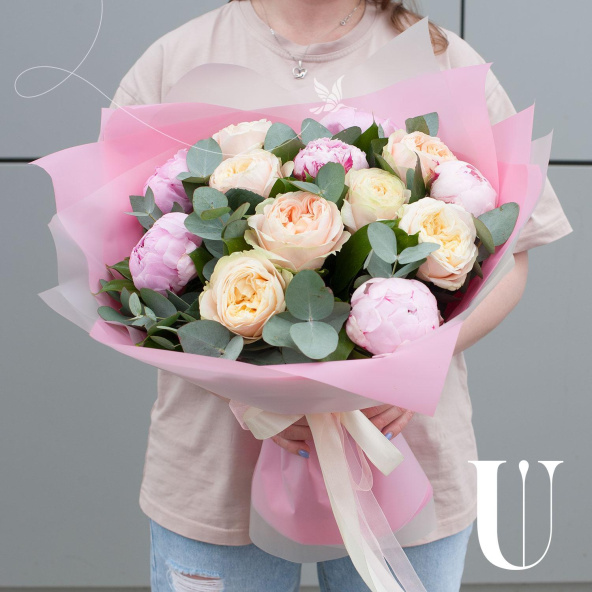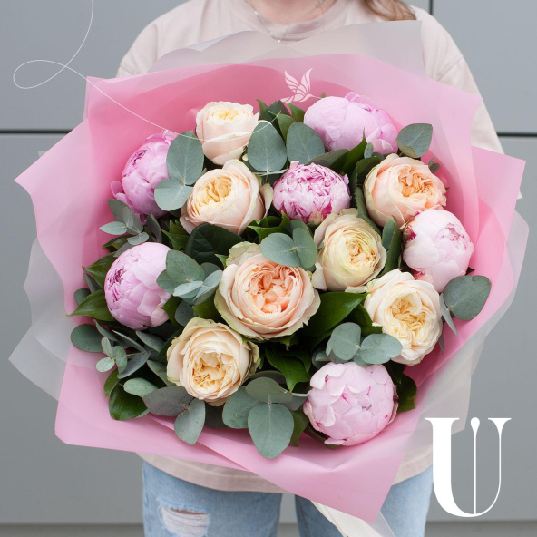 Букет состоит из 7 пионовидных роз и 6 розовых пионов, которые придают ему неповторимый шарм и очарование. Зеленые листья салала и ветви эвкалипта добавляют свежести и легкости, делая букет еще более привлекательным.