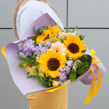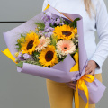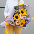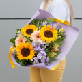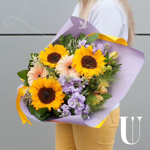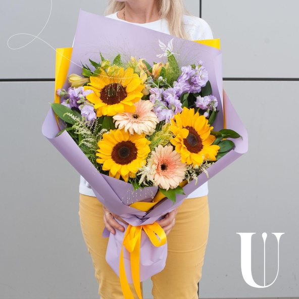 Букет состоит из 15 различных видов цветов, включая подсолнухи, маттиолу, герберы, астильбу, альстромерию, паникум и салал. Такое разнообразие позволяет создать яркую и запоминающуюся композицию, которая будет радовать получателя своей красотой и свежестью.