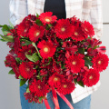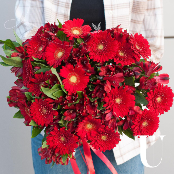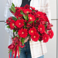 Букет цветов "Очаровательная Скарлет" - это сборный букет, состоящий из минигербер и альстромерий.