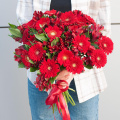 Букет выполнен в красных тонах, что делает его ярким и запоминающимся.