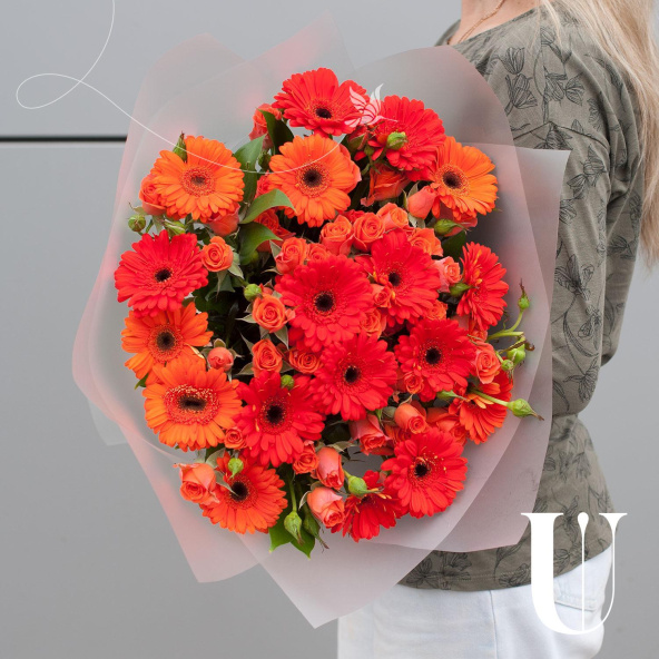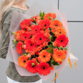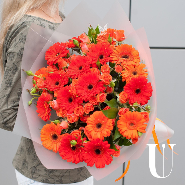 Букет "Оранжевое солнце" - это уникальное сочетание оранжевых минигербер и кустовых роз, которое создает неповторимую атмосферу тепла и радости.