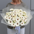 Букет в белой гамме из минигербер и пионовидных кустовых роз "Айс" - это стильный и элегантный выбор для любого повода.
