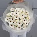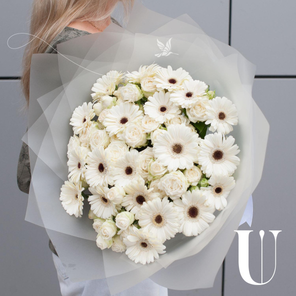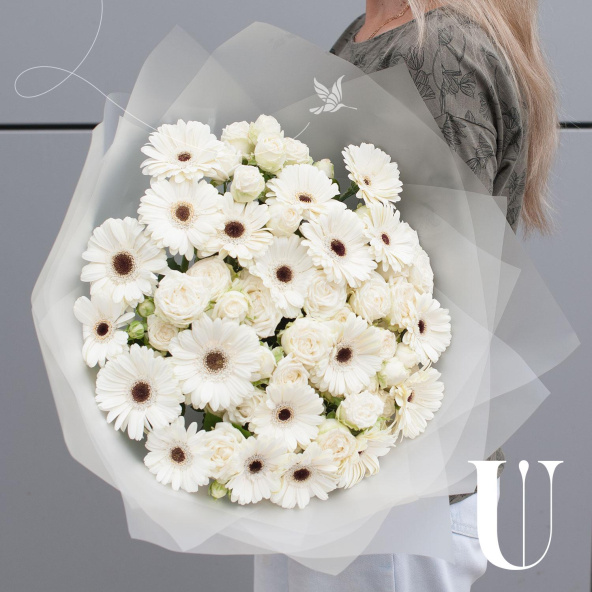 Выбирая букет в белой гамме из минигербер и пионовидных кустовых роз "Айс", вы получаете стильный, элегантный и качественный подарок, который будет радовать получателя своей красотой и ароматом.