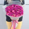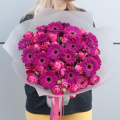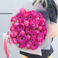 Букет в лиловых тонах "Присцыла" - это сборный букет, состоящий из 29 минигербер, 20 пионовидных кустовых роз и оформленный в пленку.