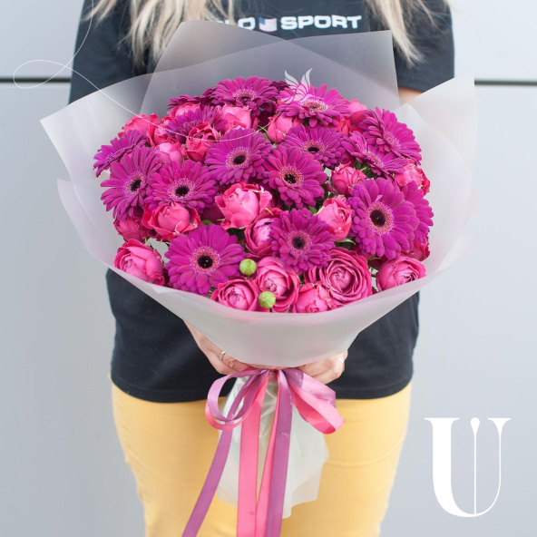Особенностью этого букета является его состав. В нем представлены три вида цветов: минигербера, роза кустовая и роза пионовидная. Такое сочетание делает букет ярким и насыщенным, а также придает ему неповторимый аромат.