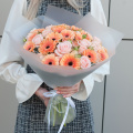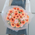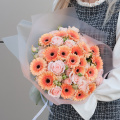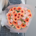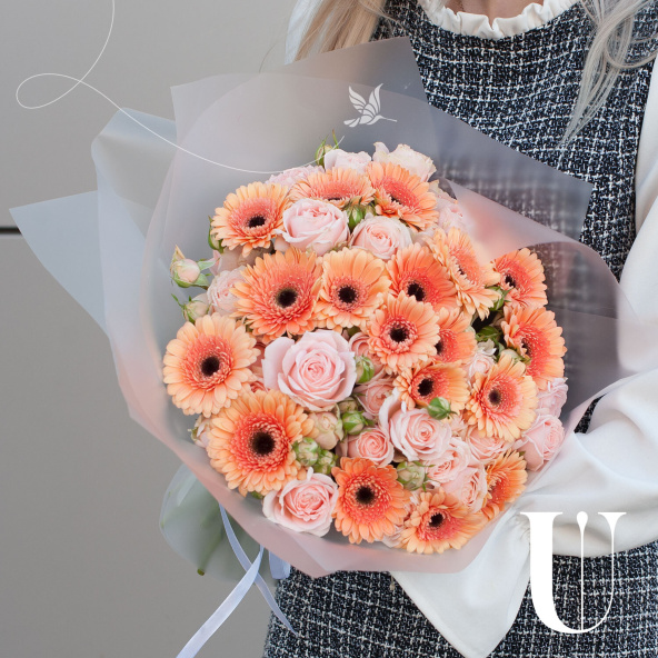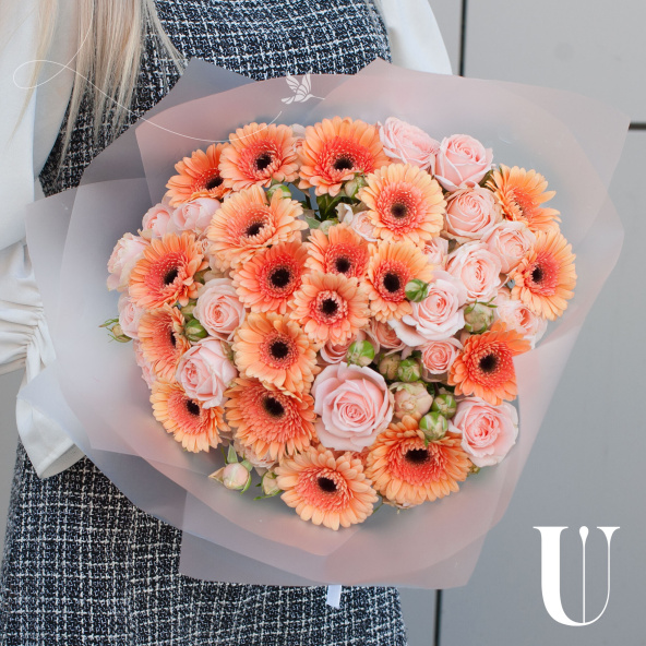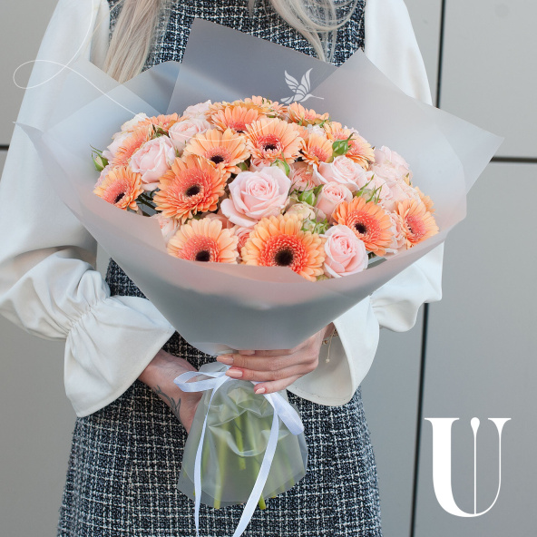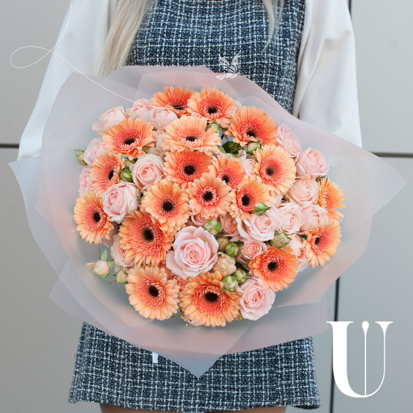 Букет из персиковых минигербер и кремовых кустовых пионовидных роз "Эспрессо" - это стильный и элегантный выбор для любого повода.