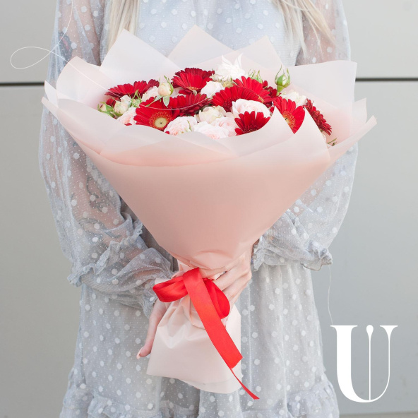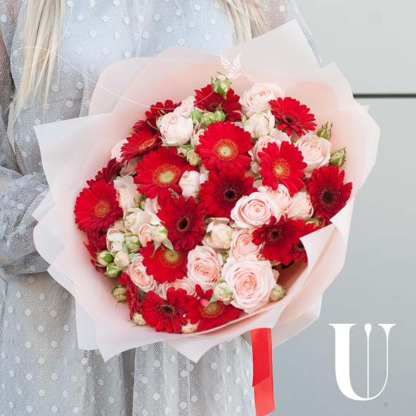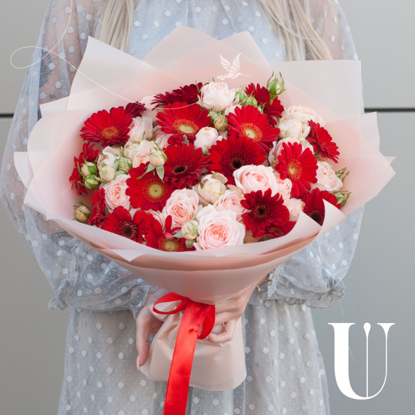 Букет состоит из 29 цветов, включая 19 минигербер красного цвета и 10 кустовых роз бежевого оттенка.