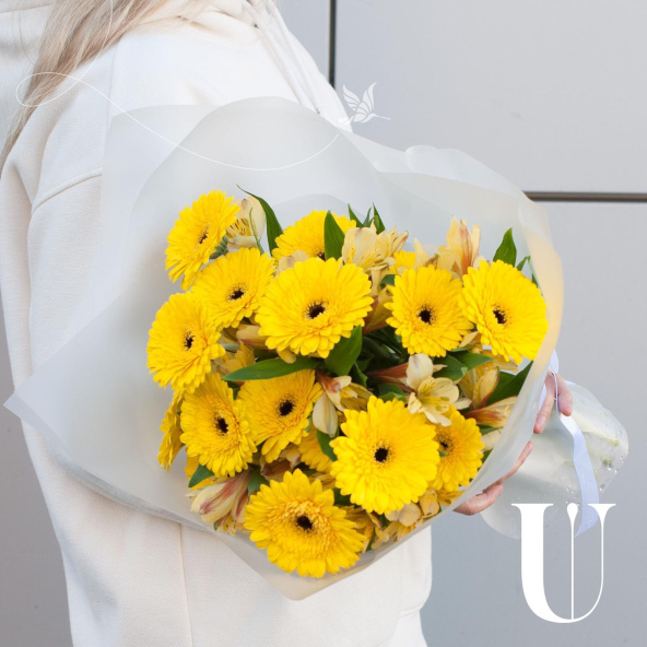 Букет состоит из 17 желтых минигербер и 10 желтых альстромерий, что делает его ярким и запоминающимся. Герберы и альстромерии - это цветы, которые отличаются своей стойкостью и продолжительным сроком жизни, что гарантирует свежесть и красоту букета на протяжении долгого времени.