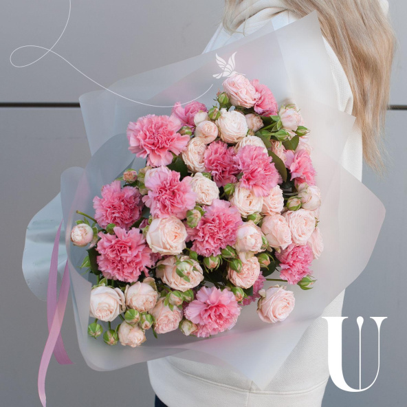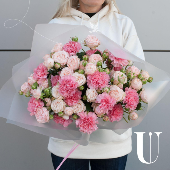 Букет цветов "Принцесса грация" - это сборный букет, состоящий из пионовидных кустовых роз, розовых гвоздик и гвоздики.