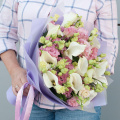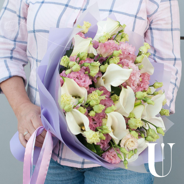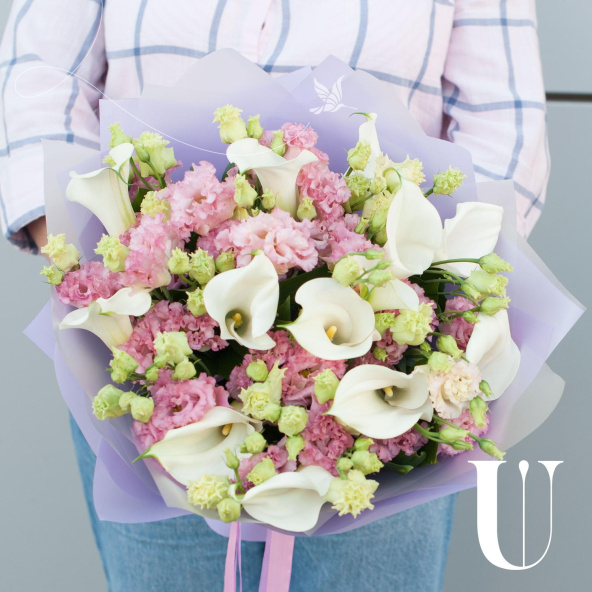 Букет из белых калл и розовых лизиантусов в дизайнерской упаковке "Рози" - это стильный и элегантный подарок, который подойдет для любого повода.