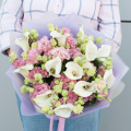 Букет из белых калл и розовых лизиантусов в дизайнерской упаковке "Рози" станет отличным подарком для любого повода, будь то День знаний, День матери, день рождения, день свадьбы, День учителя, рождение ребенка или юбилей.